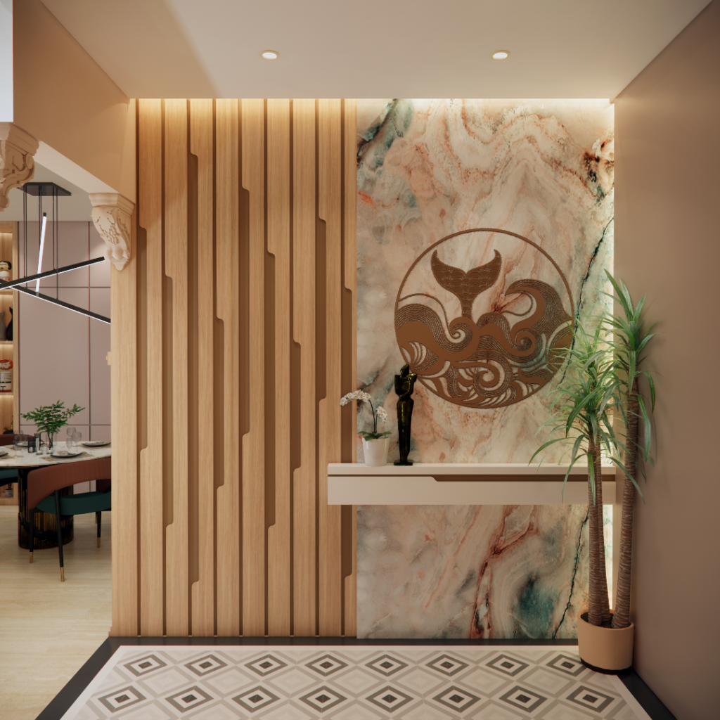 A dramatic wall medallion inspired by Indian symbolism introduces the home — not just physically, but emotionally. It is bold, spiritual, and grounding. Fluted panels and a minimalist ledge create a backdrop that honors tradition without feeling dated. You don’t step into a corridor; you step into a curated pause.