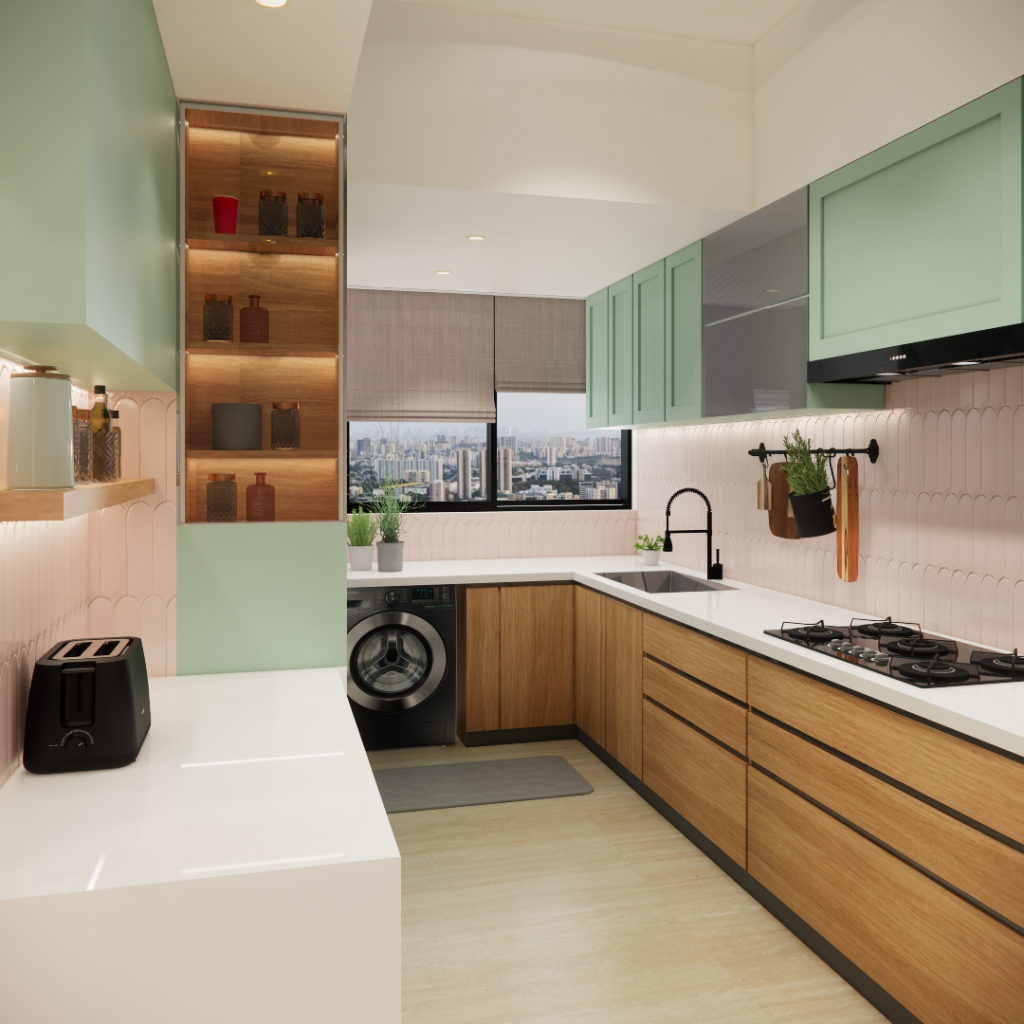 The kitchen is where luxury takes a playful turn. Pastel tones — mint and blush — are paired with clean whites and natural wood, softening the utilitarian space into something joyful and light. A curved backsplash detail hints at vintage charm, while the cabinetry is crisp and seamless.