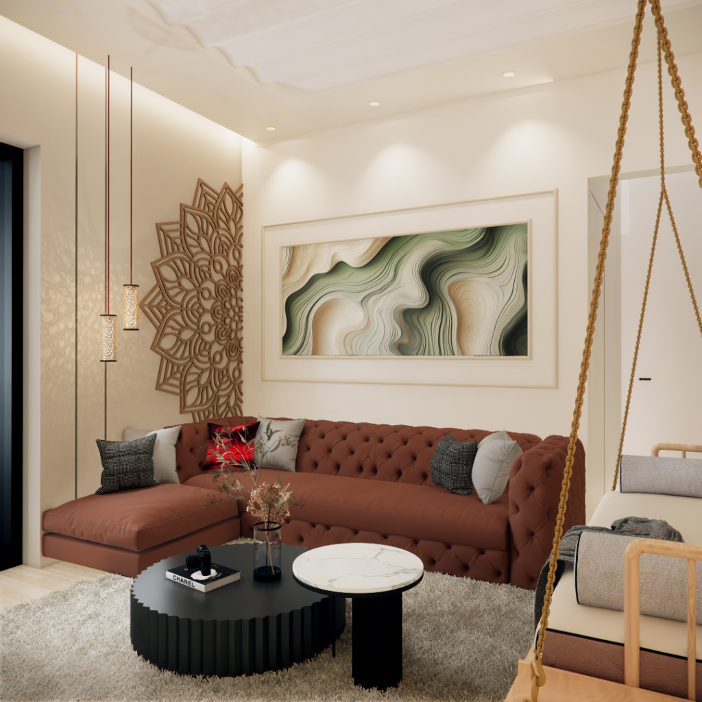 The living space is expansive but not loud — it speaks in measured tones. A deep leatherette sofa anchors the room, while a floating swing draws the eye with sculptural poise, recalling traditional Indian homes in a modern language. Textures are layered — fluted walls, plush upholstery, and polished stone come together in a palette that’s both serene and rich.