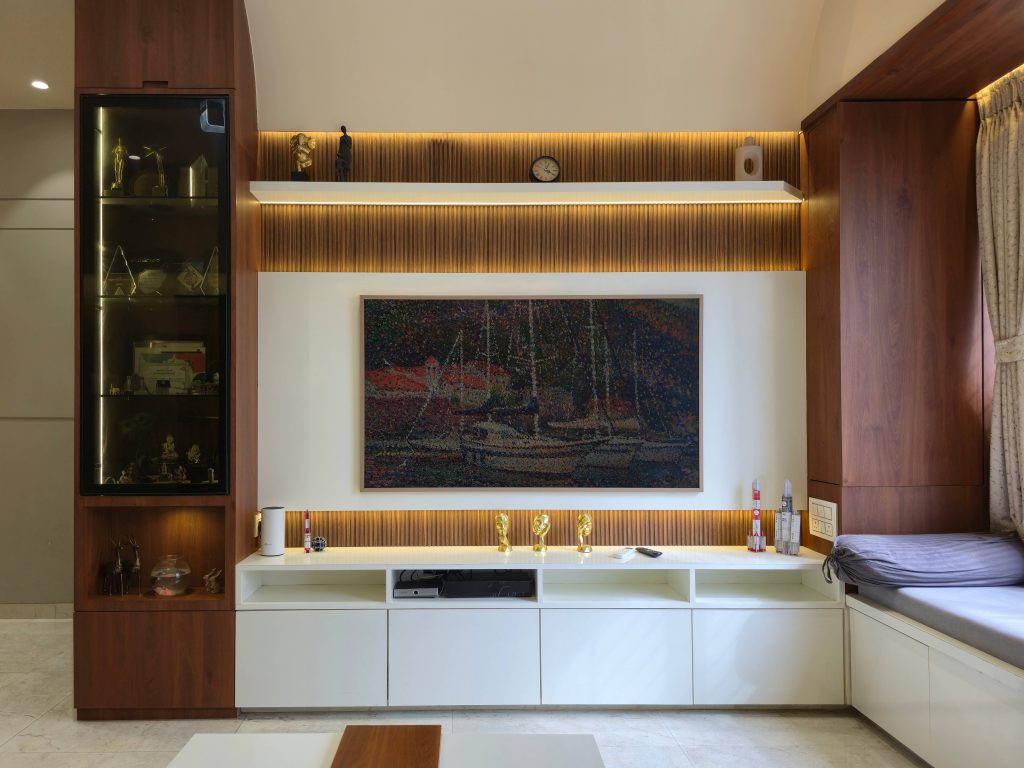 The living room is where the story begins. Anchored by a plush, inviting sofa in a muted grey-beige, it balances comfort with crisp design lines. The TV wall becomes a visual centerpiece, combining vertical wooden flutes, ambient cove lighting, and pristine white cabinetry — delivering both style and storage without crowding the space.