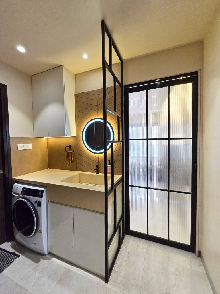 Tucked cleverly beside the common zone is a Corian wash basin counter — minimal, monolithic, and refined. With a seamlessly integrated sink, vertical backsplash detail, and a circular backlit mirror, it turns a functional area into a striking design corner. The washing machine below is tucked away neatly, preserving visual continuity.