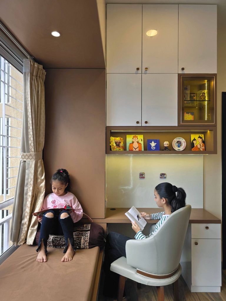 In the midst of a fast-paced urban landscape, this home unfolds as a quiet sanctuary — designed to nest its occupants in a palette of calming neutrals, functional grace, and layered warmth. The interiors speak softly, with tones of beige, ivory, and walnut gently wrapping around carefully carved zones of comfort and utility. Every element — from the tiniest display niche to the reimagined window seating — is a nod to thoughtful living rooted in elegance.